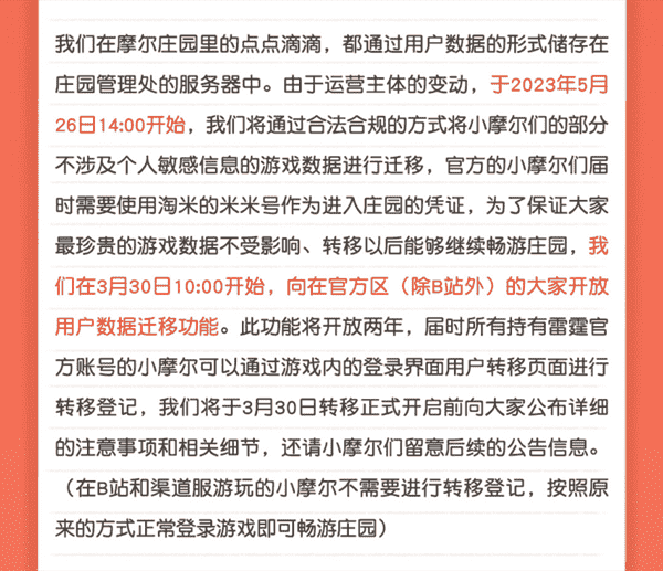 合作结束本就是开发方和代理方双方的事情,,降低这件事情对玩家的影响,,才是对所有珍视这段童年的摩尔玩家最好的呵护。。。。目前看来,,,用户完全不用担心后续因无法登录游戏而造成任何数据上的损失,,只要及时进行账号转移,,就可以好好保留、、延续在庄园的痕迹和回忆,,,,继续在庄园里做快乐的红鼻子小鼹鼠。。。。