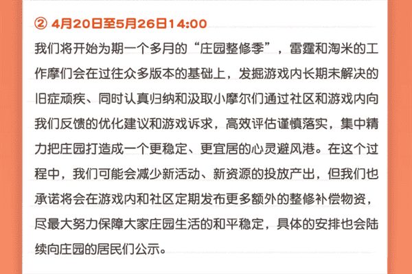 合作的结束并不意味着这个童年IP的结束,,,,对于《摩尔庄园》手游而言,,这是一个新阶段的开始。。后续游戏内将开启庄园重构计划,,,,会就以往遗留下来的BUG进行集中修复,,,并在游戏内和社区定期发布更多补偿物资。。。